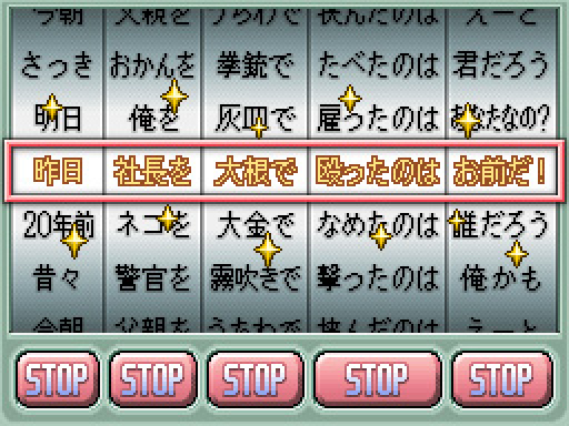 「真犯人はどうでも良し 事件を解決しさえすればいい」という、けしからんスタンスのAVG。通常のコマンド選択式では無く、スロットから目押しで選ぶのが新鮮か。善良な市民を犯人に仕立て上げるという内容なので、清い心の持ち主にはオススメ出来ない。個人的には不快。価格設定も腑に落ちない。