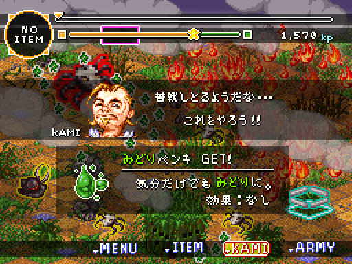 大層なゲーム目的だと思ったけど、ステージクリア画面の種明かしに驚き。大地だと思っていた所は、おじさんの頭だったんだから。…え?これカツラ?生やした草の量・形に応じておじさんたちのその後の人生が変化していくのは良いけど、肝心の草がどれも同じに見えて、もう少し変化が欲しかったかな。