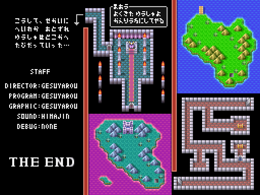 ジャンル名の「RPGみたいなの」とはその言葉通りで、武器も装備出来なければエンカウントも無い 「魔王」の前まで行きボタンを押すと、それで「魔王」は死んでスタッフクレジットに進める様になる。全ゲーム行程でこれだけ。ケンカ売ってるのか?「THE END」までプレイヤーに自力で歩かせるというこの発想のあんまりさ加減に衝撃を受け、ここにノミネートし晒す事に。「他に類を見ない」という所で1点入れたが、それだけだ。