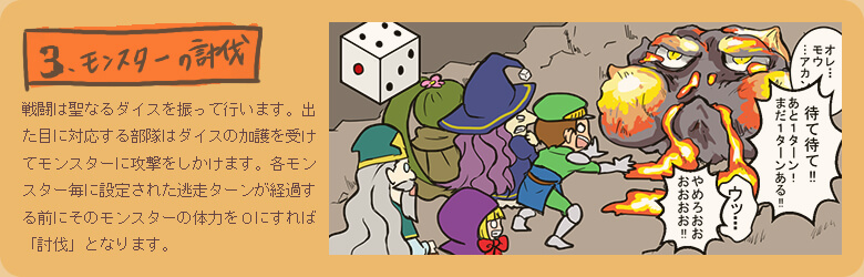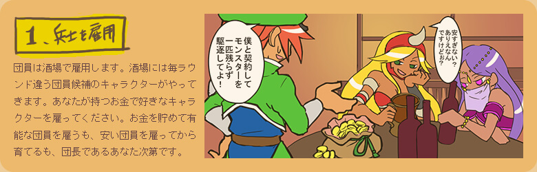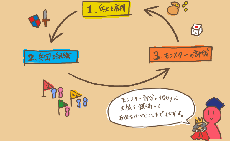 団員を雇用して兵団を作り、モンスターを討伐して兵団を強化し、最終的に魔王を倒すことでゲームクリアとなります。
