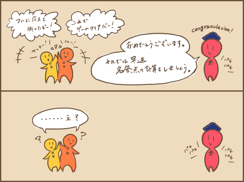 見事魔王を討伐してゲームをクリアした暁には、名誉点の比較をします。