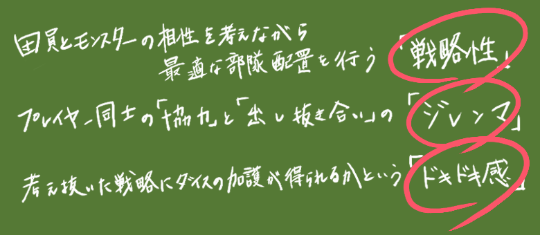 一筋縄ではいかない奥深いシステムに頭を使いながら、ダイスの出目に一喜一憂したりもしてワイワイ楽しめる。